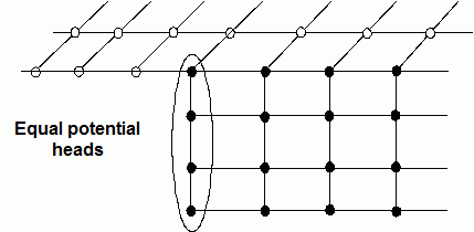 Specifying equal potential heads over the full height at the boundary nodes of the 3D area is a useful method for the transition condition. It means that the potential head at the nodes is unknown and must be computed during the calculation. But there is a second condition that defines a constant potential head for all nodes, one below the other (see identification GLEI). Mathematically, in the equation system, the single nodes are summed and represented by one representative node. The other nodes are eliminated.