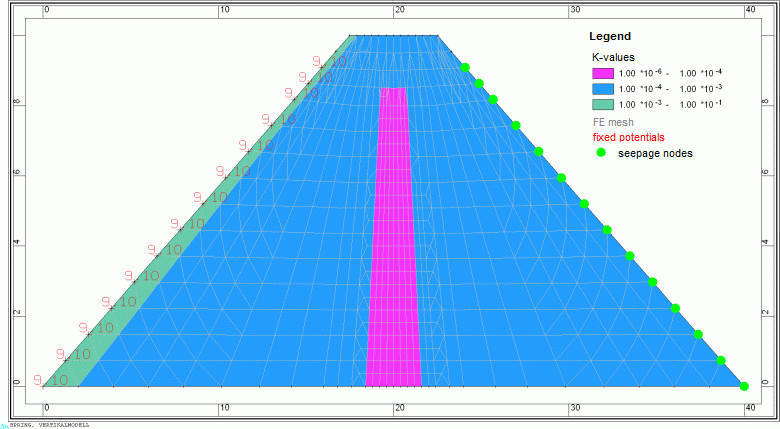 Where the seepage line intersects the land side of the dam water percolates to the surface. In figure 6 you can see it at three nodes at the right bottom of the dam. In SPRING you can assign the percolation rate to any attribute with Attributes Import result data, selecting the background file "aaa" and selecting "Seepage rate [m³/no./TU]", e.g. to "KKKK". With View