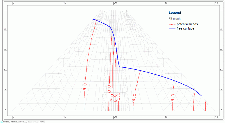 Result data potential heads and seepage surface of the dam