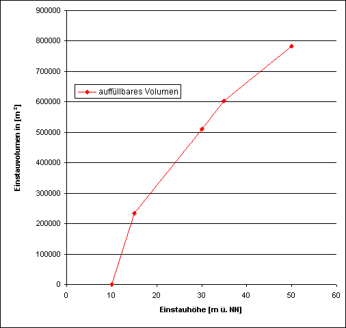 Für eine instationäre Berechnung liegt für die betrachtete Grube eine stetig steigende Kurve zur Beschreibung des Verhältnisses des eingestauten Volumens (m3/s) zur Einstauhöhe (m NN) vor.