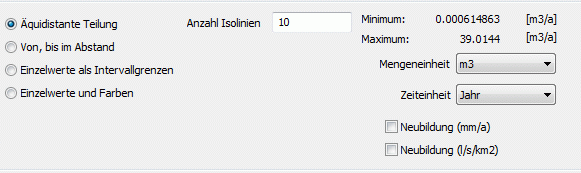 Durch die Pfeiltasten können die Mengeneinheit (m³ oder Liter) und die Zeiteinheit (Jahr, Monat, Tag, Stunde Minute, Sekunde) beliebig bestimmt werden oder durch Aktivieren eines der beiden Kontrollkästchen die voreingestellte Einheit für die Neubildung gewählt werden. In dem Fall werden die anderen Möglichkeiten deaktiviert (ausgegraut).