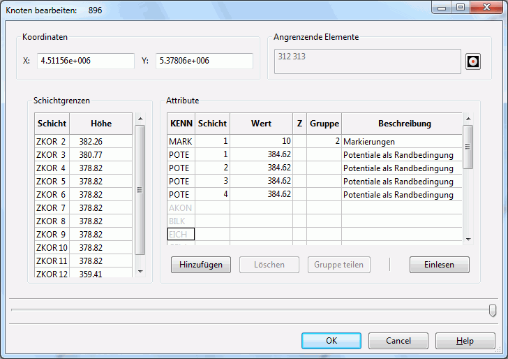 Hier können Attribute des Knotens hinzugefügt (linker Button), gelöscht (rechter Button) oder über manuelle Eingabe in die Zellen der Tabelle verändert werden (Wert, Gruppenzugehörigkeit oder Attributzeichen (Z)). Nach dem Öffnen des Modells sind die Knotenattribute noch nicht geladen. Erst durch Markieren des zu bearbeitenden Attributs und anschließendem Anklicken des Buttons "Einlesen" werden die zugehörigen Knotenwerte aus der Modelldatei eingelesen und können dann bearbeitet werden. Zunächst werden alle in der Modelldatei vorhandenen Knotenattribute angezeigt. Ist ein markiertes Attribut an diesem Knoten nicht vorhanden, verschwindet dieser Eintrag nach Anklicken des Buttons "Einlesen".