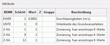 Zur Berücksichtigung von anisotropen K-Werten muss zunächst den Elementen mit gleicher Anisotropie eine Zone (Attribut ZONE im Horizontalmodell, Attribut Z-KA im 3D-Modell) zugewiesen werden (Attribute