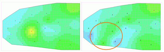 Links: Stützstellen und Ausgangs-K-Werte. Rechts: Eingekreist ist das Gebiet der variablen K-Werte (Spalte I=0). Die K-Werte an den übrigen Stützstellen werden festgehalten (Spalte I=1), müssen aber trotzdem in der Parameterdatei verbleiben, damit die Interpolierung durchgeführt werden kann.