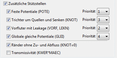 Nach Speichern der Datei und einer Modellprüfung können nun in der Erweiterung "Zusätzliche Stützstellen" die Checkboxen "Vorfluter mit Leakage" und "Ränder ohne Zu- und Abfluss" aktiviert werden.