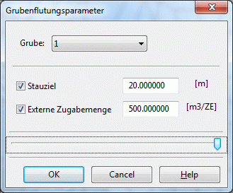 Wenn das Attribut GRUB (Bilanzknoten für Grubenflutung) vergeben ist, lassen sich über das folgende Eingabefenster das Stauziel und die Zugabemenge für die einzelnen Gruben zuweisen. Eine ausführliche Beschreibung findet sich im "How To – “Flutungssimulation von Grubenbauwerken“.