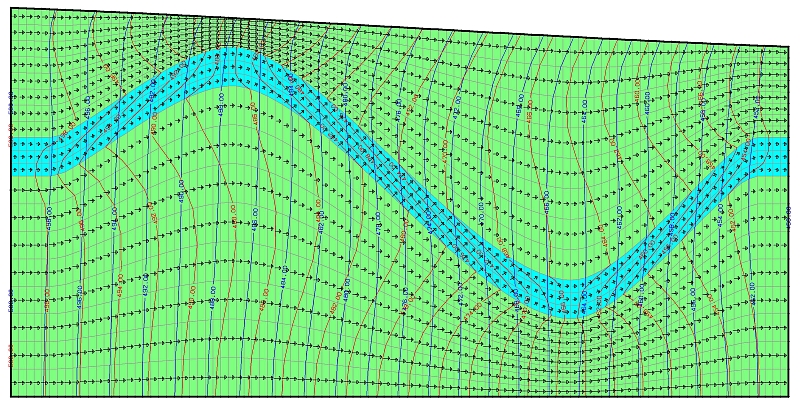 Die folgende Abbildung zeigt das Ergebnis der Strömungsberechnung mit (rote Potentiallinien) und ohne (blaue Potentiallinien) Berücksichtigung der schichtkorrigierten K-Werte für alle Schichten: