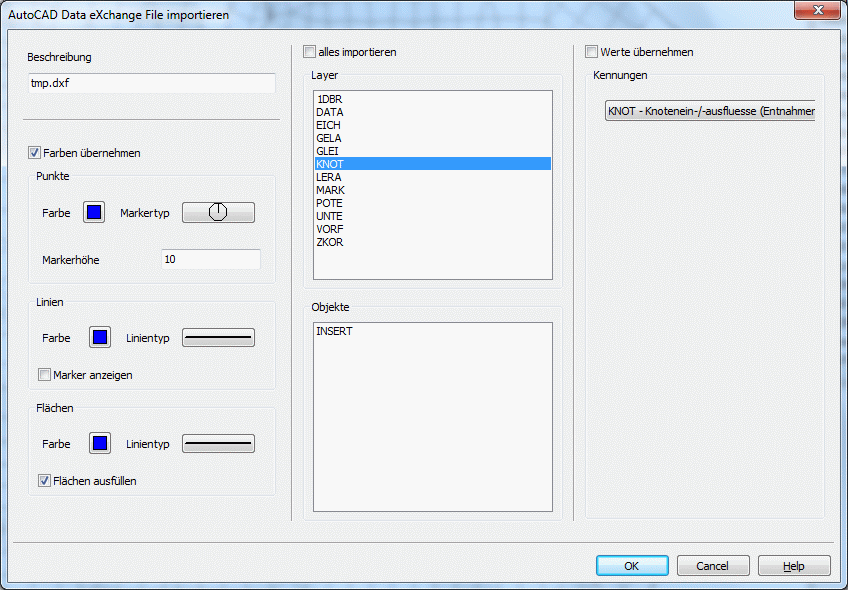 Neben den Darstellungsattributen für die unterschiedlichen Strukturtypen und der Attributzuweisung kann hier gewählt werden, ob alle Layer der *.dxf-Datei oder nur einzelne anhand einer Listenauswahl importiert werden. Die Werte können auf Wunsch ebenfalls übernommen werden.
