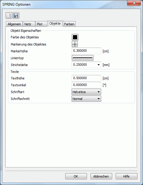 Voreingestellte Schriftart und Schriftschnitt: (Variable SPRINGfontDefault), zur Auswahl stehen die Fonts: Helvetica, Roman, Courier, Symbol sowie die Schriftschnitte: normal, fett, kursiv, fett und kursiv.