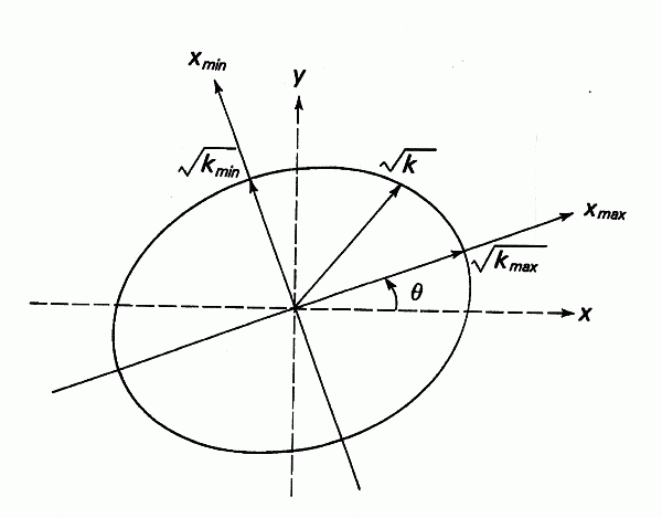 The axes Xmax and Xmin denote the axes X and Y which are rotated by the angle Θ. Kmax and Kmin are the maximum and minimum conductivities in the direction of the respective axes. K is the resulting effective conductivity in the direction of flow, which is calculated within the flow calculation.
