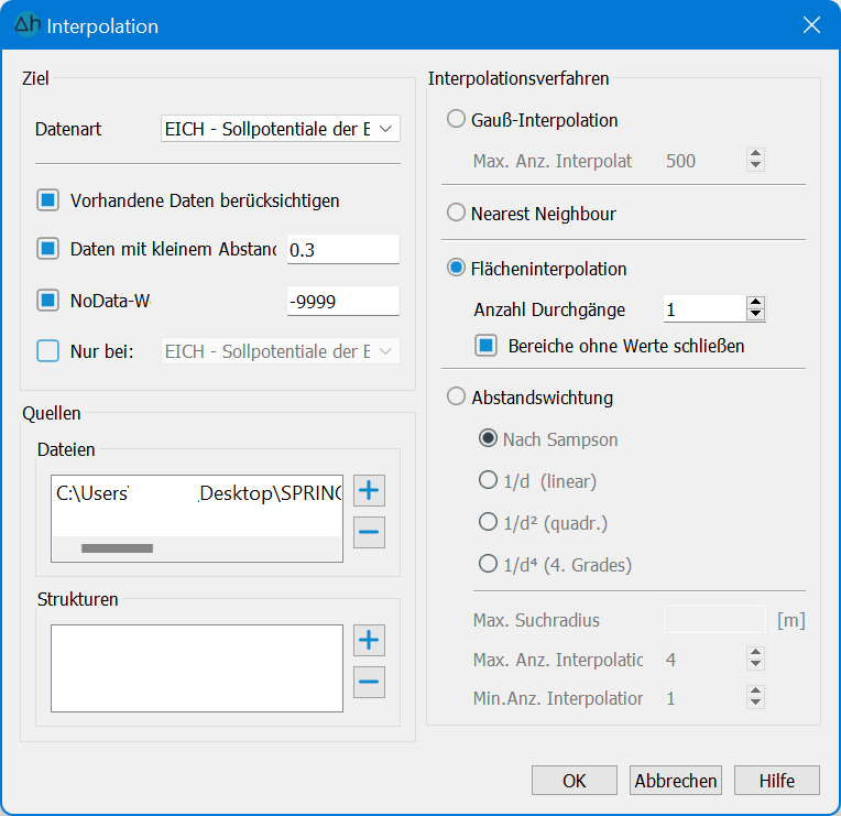 Zusätzlich wird der Menüpunkt "Vorhandene Daten berücksichtigen" aktiviert. Dadurch werden die unter der als Ergebnisdaten ausgewählten Datenart (hier EICH) bereits vorhandenen Daten bei den Interpolationspunkten berücksichtigt. Ergebnisdaten sind hier die EICHpotentiale.