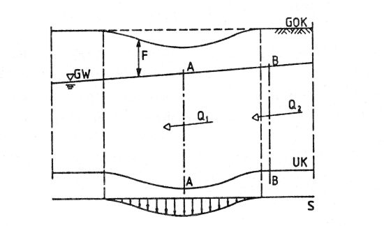 In der Grafik (stationäre Strömung) muss von Schnitt A – A nach Schnitt B – B die Kontinuitätsbedingung (Q1 = Q2) erfüllt sein. Da sich in senkungsbeeinflussten Bereichen die wassererfüllte Mächtigkeit vergrößert, ergeben sich Auswirkungen auf die Strömung selbst.