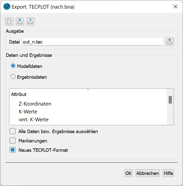 Die Ausgabe für TECPLOT schreibt generell die Modell- oder Ergebnisdaten für alle Schichten weg. Im Programm TECPLOT kann der Anwender dann die gewünschte Schicht auswählen.