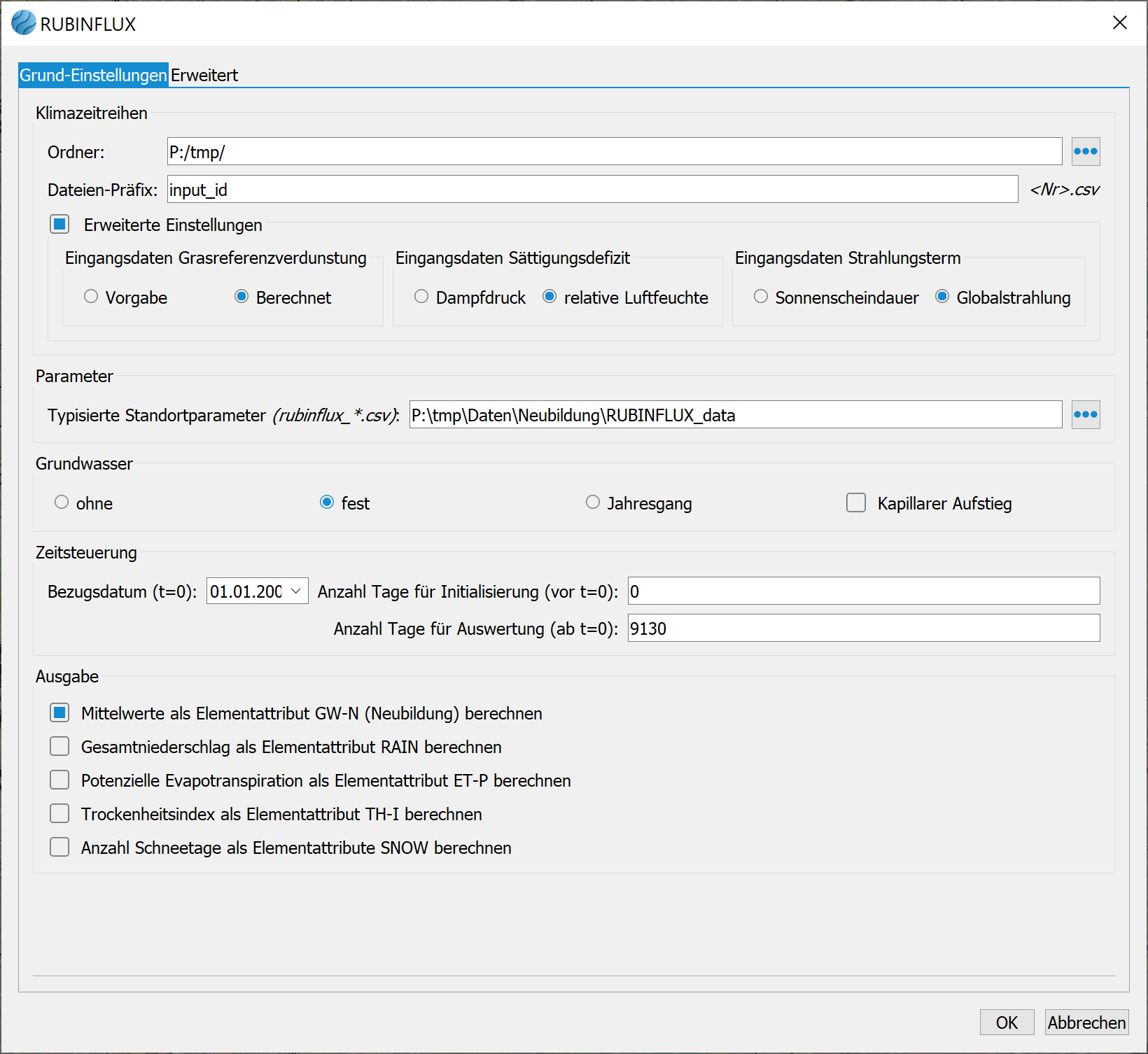 Liegen alle Eingangsdaten (erforderliche Modelldaten und Klimazeitreihen) vor, werden hier die instationären Neubildungsraten entweder für eine instationäre Eingabedatei oder als mittlere Neubildung für die Modelldatei berechnet. Alternativ kann während einer instationären Strömungsberechnung mit den gleichen Eingabeparametern eine „on-the-fly“-Berechnung der täglichen Neubildungsraten durchgeführt werden. Näheres dazu findet sich im Kapitel „Instationäre Strömungsberechnung – RUBINFLUX“.