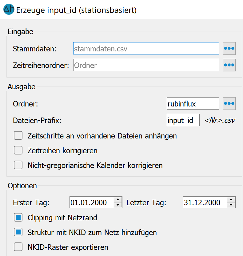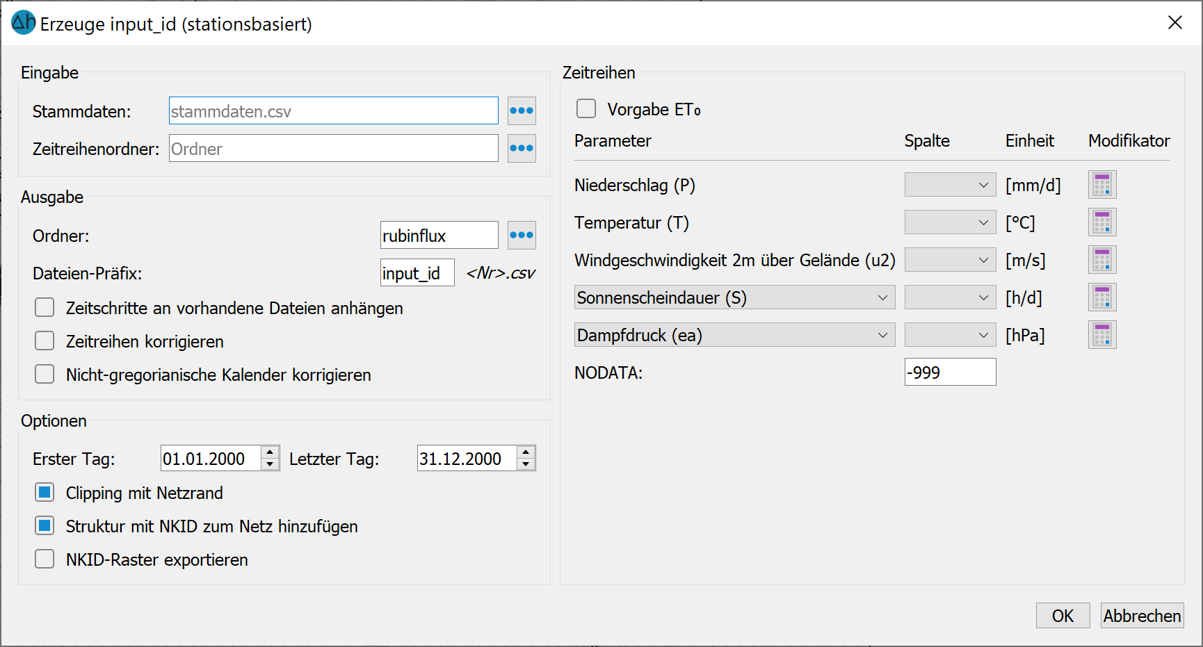 Die rechte Seite des Dialogfensters dient derm Einlesen und Definieren der Eingangsdaten (Klimazeitreihen aus Stationsdaten, z.B. vom Climate Data Center (CDC) des DWD).