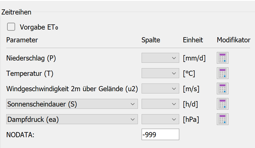 Falls die Stationsdaten Werte für ET0 statt Temperatur, Sonnenscheindauer, etc. enthalten, wird das Kontrollkästchen aktiviert. In dem Fall muss lediglich für den Parameter "Niederschlag" der zugehörige Spaltenname der Eingabedatei zugewiesen werden.