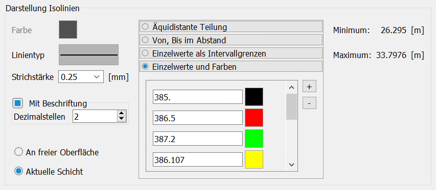 Bei der Einteilung mit Einzelwerten und Farben werden die gewünschten Isolinienwerte mit den entsprechenden Farben in einem separaten Fenster eingegeben. Die Farbauswahl im linken Teil des Eingabebereiches ist deaktiviert und wird beim Plot nicht berücksichtigt.