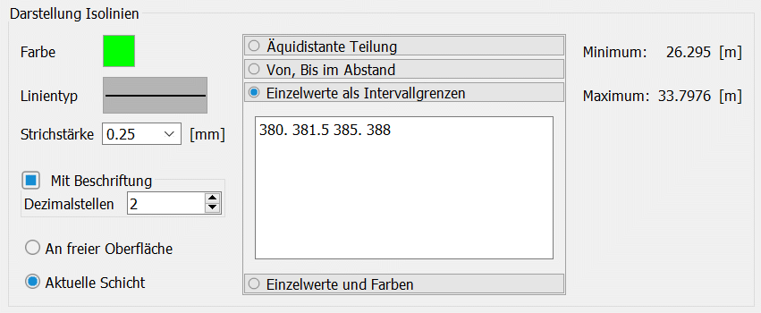 Bei der Einteilung mit Einzelwerten als Intervallgrenzen werden die gewünschten Isolinienwerte in einem separaten Fenster eingegeben. Mehrere Werte werden getrennt durch Leerzeichen eingegeben. Das Dezimalzeichen bei den Werten muss ein Punkt sein.