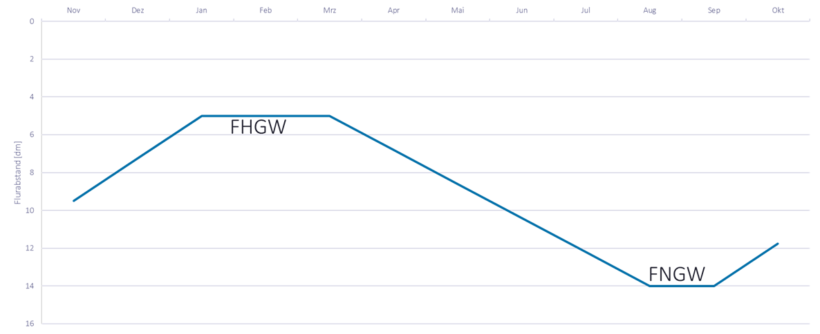 By activating the buttons fixed or seasons, it can be selected which groundwater level should be considered in the recharge calculation. In this case, the simulation depth specified in the location parameters is overridden when the predetermined value is reached. When groundwater emerges at the ground surface (ground level distance >= 0), the recharge portion goes into direct runoff. When the 'fixed' button is selected, the EICH potentials from the model file are used for the calculation. Selecting the ‘seasons' button uses the minimum and maximum ground level distances that occur for the calculation. The minimum ground level distance corresponds to the ground level distance at high groundwater levels (attribute FHGW). The maximum ground level distance corresponds to the ground level distance at low groundwater levels (attribute FNGW). The attributes must first be determined by the user from the corresponding time series or groundwater contour plans and assigned to the model nodes.