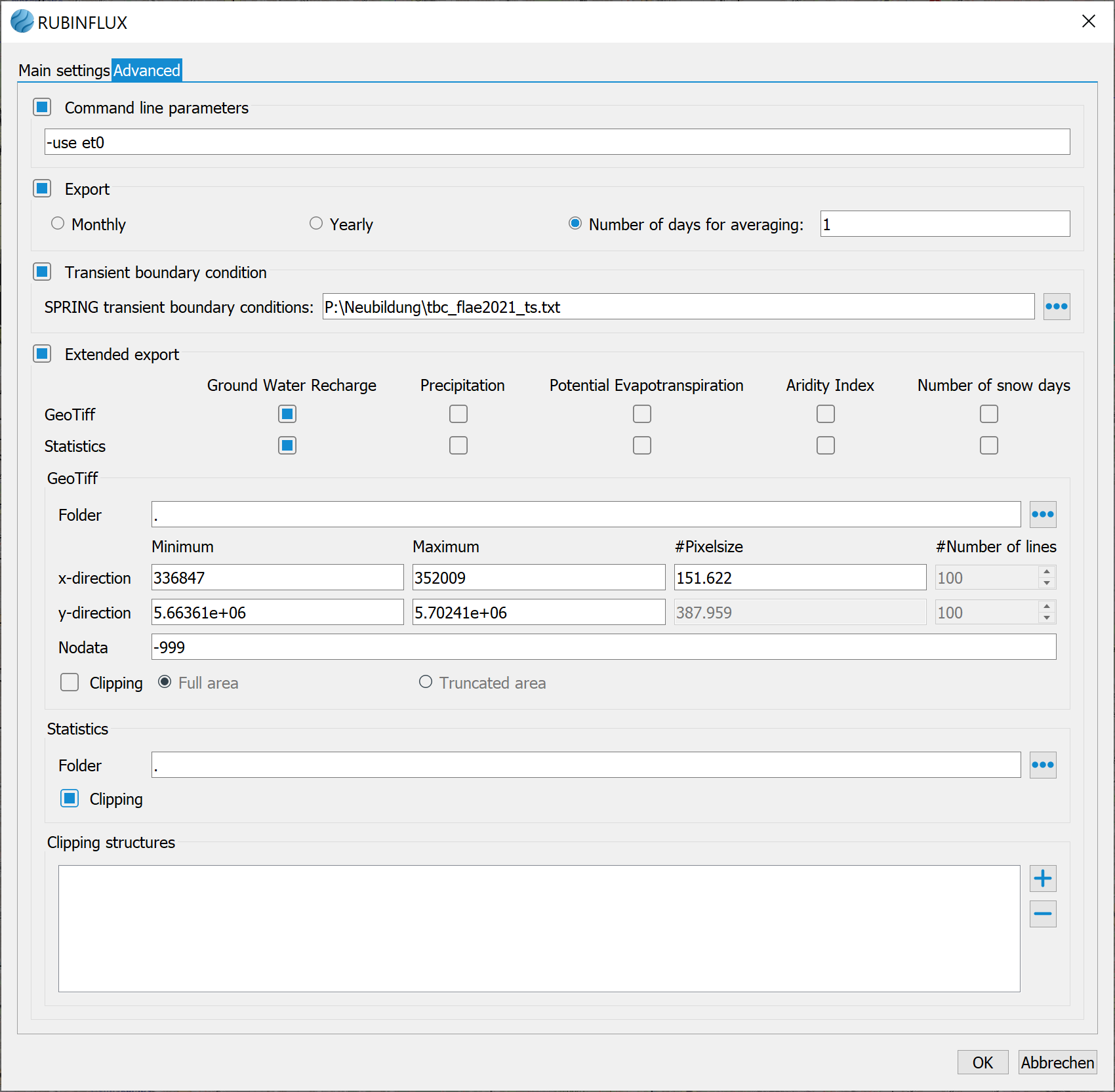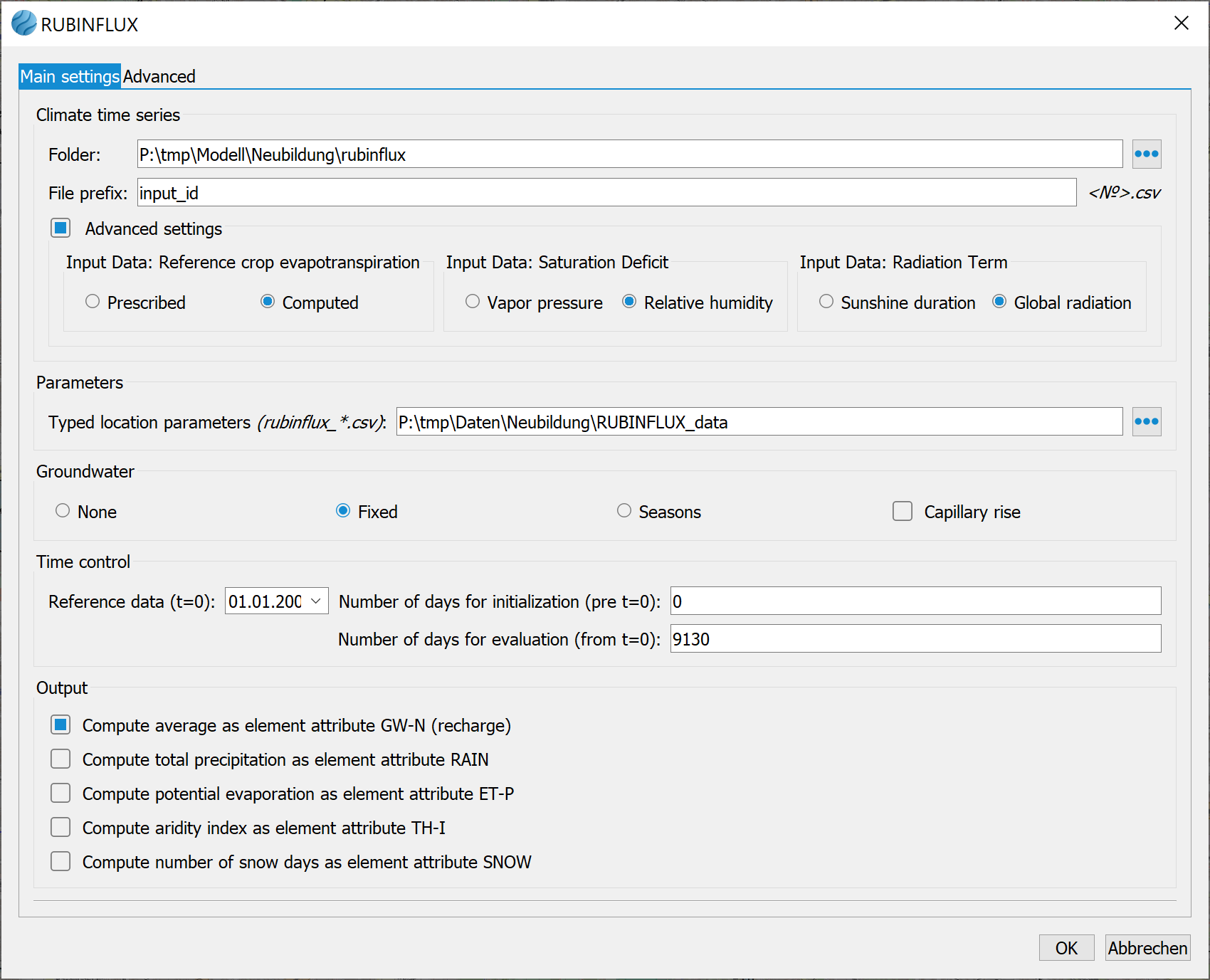 If all required input data (required model data and climate time series) are available, this function calculates the transient recharge rates. These rates are calculated either for a transient input file or as mean recharge for the model file. Alternatively, an "on-the-fly" calculation of the daily recharge rates can be carried out during transient flow calculation using the same input parameters. More details can be found in the chapter "Unsteady flow calculation - RUBINFLUX".